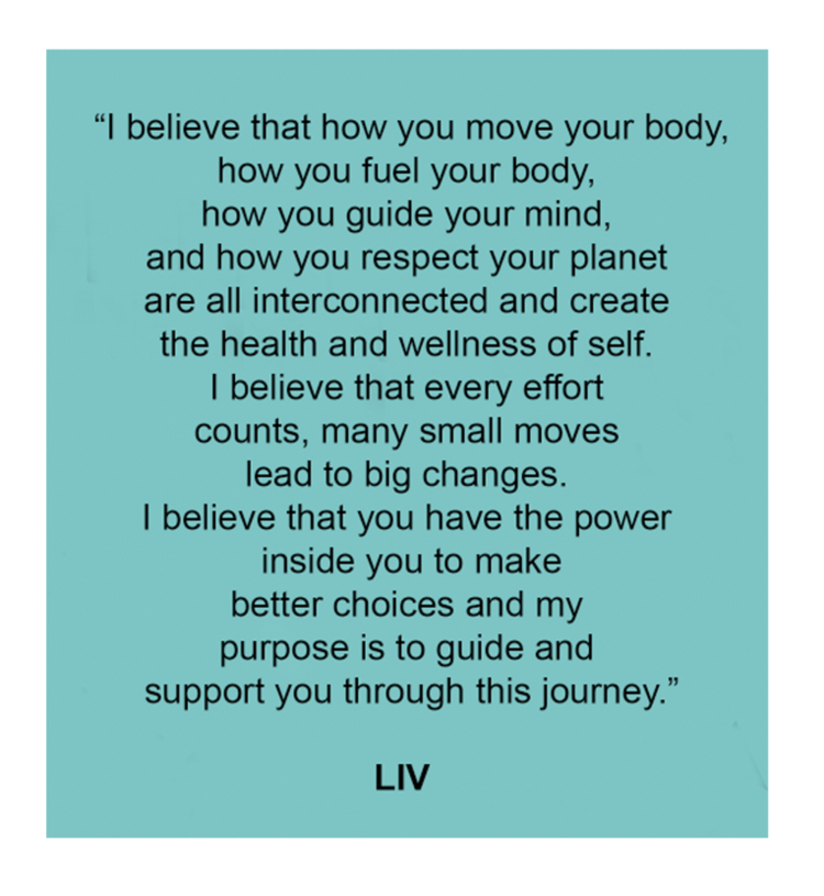 I try to align everything I do with a core desire to help others be their best and achieve the goals that are most important to them. This has led me to my core philosophy: “I believe that how you move your body, how you fuel your body, how you guide your mind, and how you respect your planet are all interconnected and create the health and wellness of self. I believe that every effort counts, many small moves lead to big changes. I believe that you have the power inside you to make better choices and my purpose is to guide and support you through this journey.”